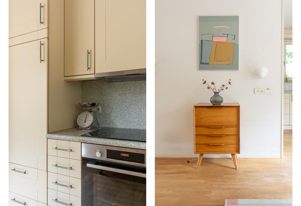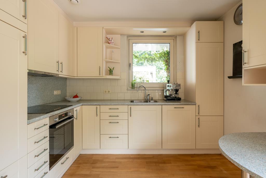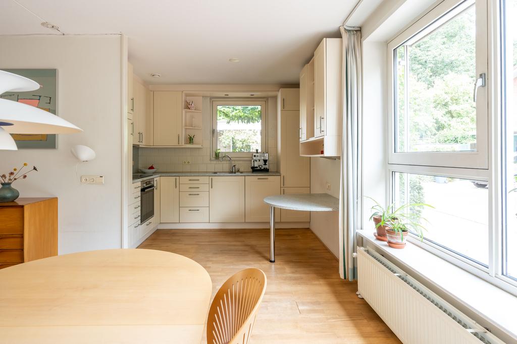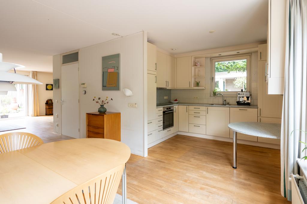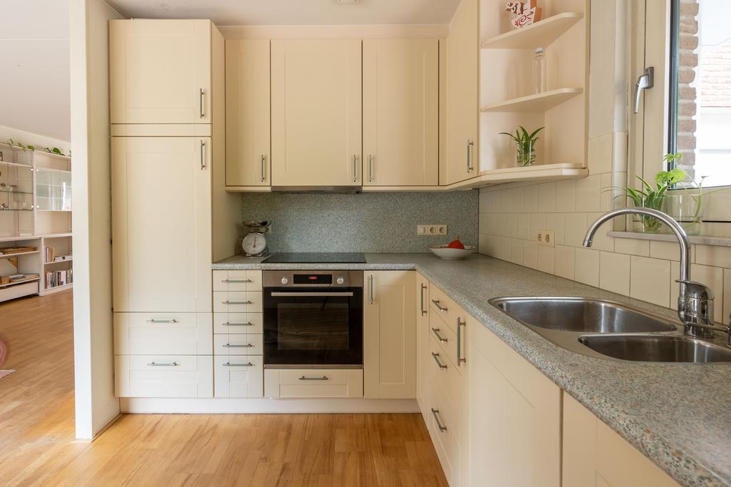 De keuken bevindt zich aan de voorzijde van de woning. Deze is in lichte kleurstelling en voorzien van inbouwapparatuur zoals een 4-pits inductie kookplaat, vaatwasser, oven en koelkast. De ruime keuken is in L- opstelling en voorzien van een vast tafelblad voor bijvoorbeeld een klein ontbijt of een eerste kopje koffie in de ochtend.