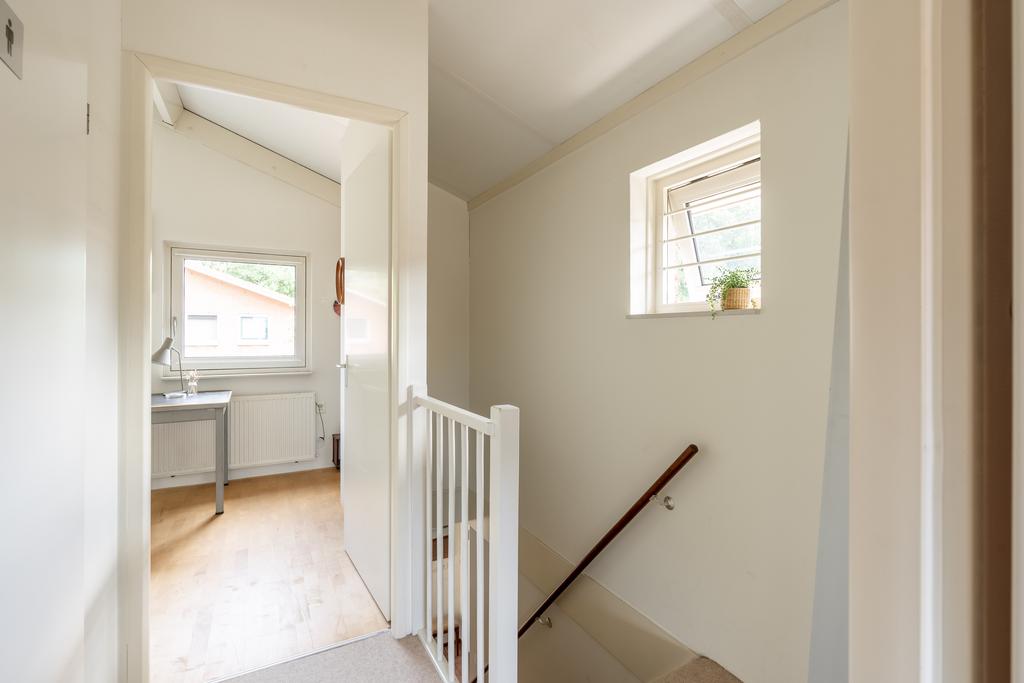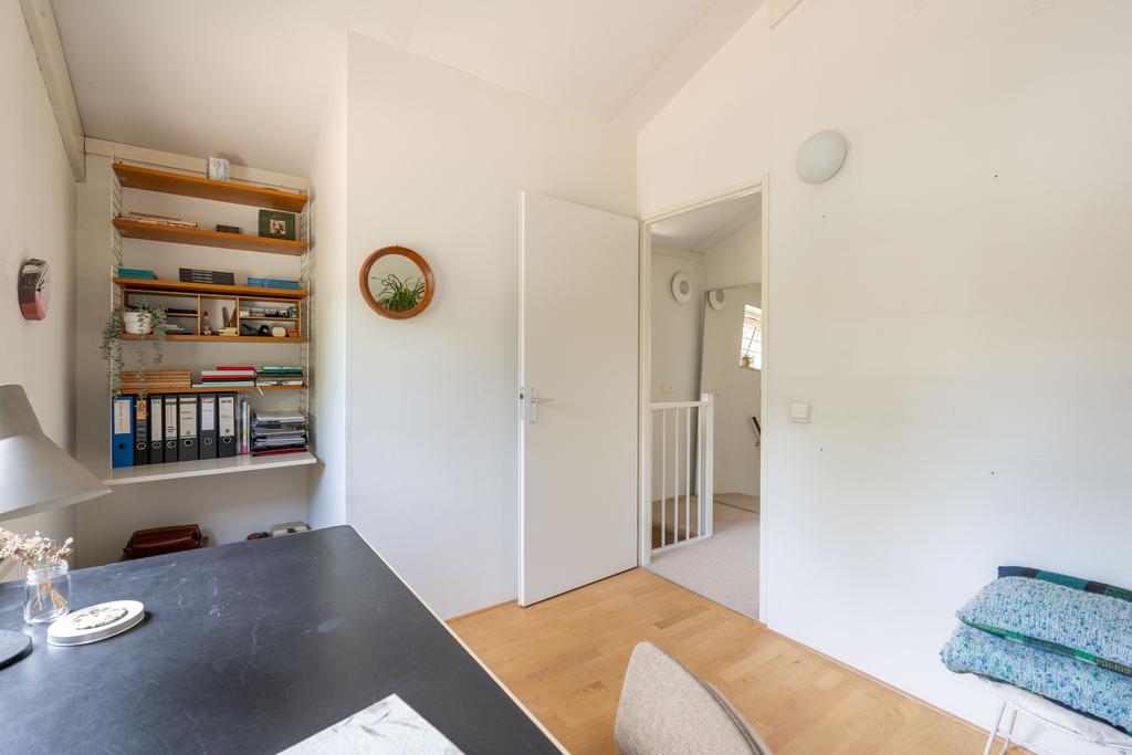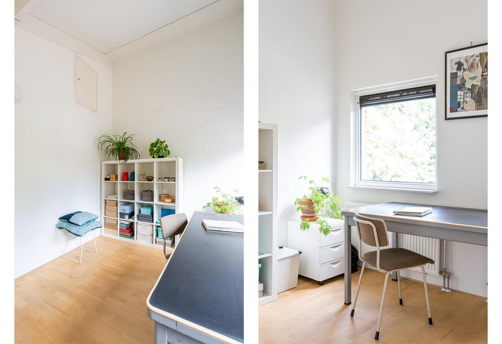 De overloop is plezierig licht door het raam in de zijgevel en geeft toegang tot twee slaapkamers en een tweede badkamer. De badkamer is in lichte kleurstelling en voorzien van inloopdouche, vaste wastafel en toilet. In beide slaapkamers ligt wederom een keurige lichte parketvloer en de wanden zijn net afgewerkt. Doordat de nok open is gehouden, voelen de slaapkamers extra ruim aan en is er plek voor bijvoorbeeld een hoogslaper waardoor kamers een dubbele functie kunnen hebben.