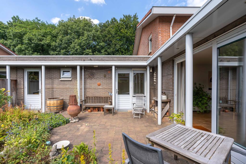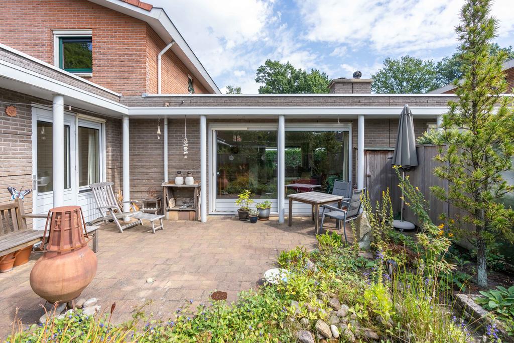 De besloten patiotuin heeft een gunstige ligging op het zuiden en zorgt daarmee voor veel licht in zowel de tuin als in het huis. Er is een ruim terras met grote groene borders. Een tuin die eenvoudig te onderhouden is en tegelijkertijd een fijne plek is om te vertoeven. De verlichting onder de overstekken aan de gevel zorgt voor een fijne belichting in de avond. In de tuin is ook nog een tuinkast voor al uw tuingereedschap.