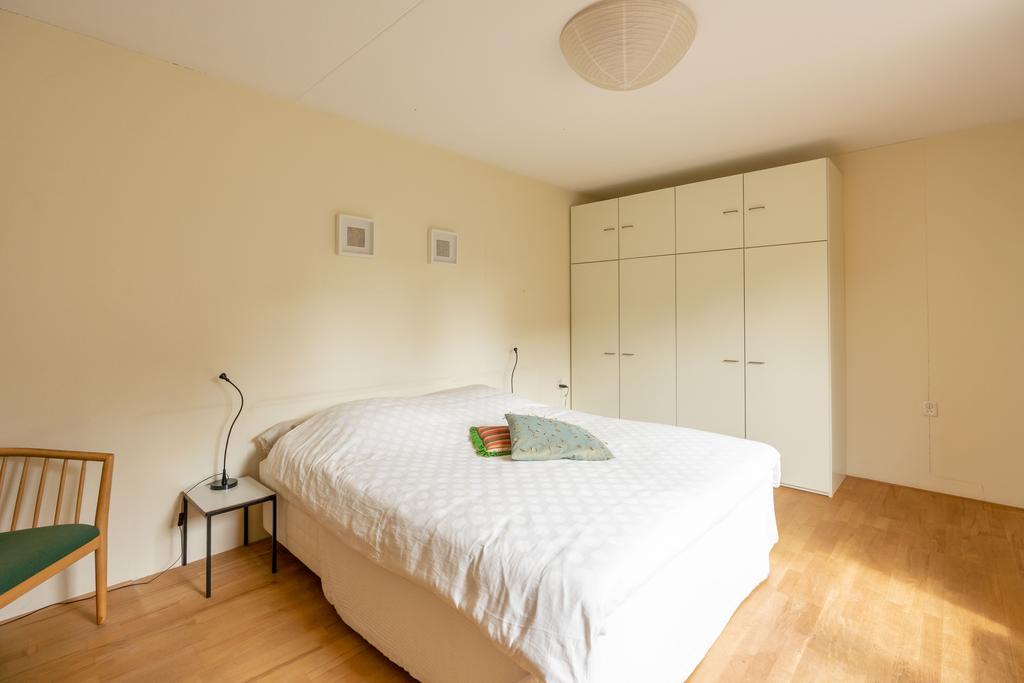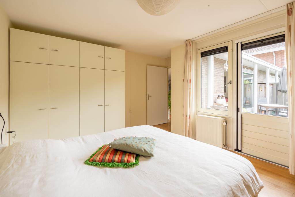 De slaapkamer is bereikbaar aan de achterzijde van de woonkamer. Ook hier vindt u weer een gelijke nette vloer- en wandafwerking. De slaapkamer is zeer ruim met 17 m2 en biedt dan ook volop ruimte voor een groot bed en veel kledingkasten. Plezierig is dat u ook vanuit de slaapkamer een deur hebt naar de tuin.