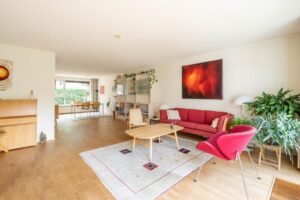 Over de hele woonkamer ligt op de vloer een massief houten parketvloer en de wanden zijn strak afgewerkt. Door de grote raampartijen aan zowel voor- als achterzijde is deze ruimte plezierig licht. Aan de voorzijde bij de keuken is de ideale plek voor een grote eettafel.