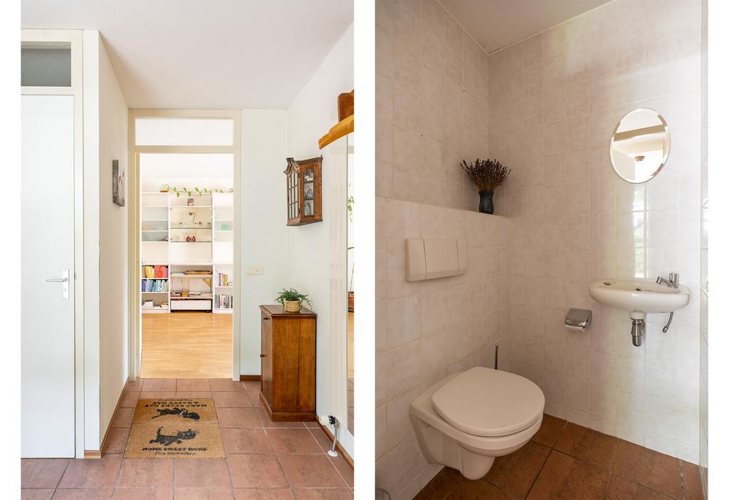 Via de overdekte entree komt u in de ruime en lichte hal met toilet met fonteintje, trapopgang, meterkast, garderobe en toegang tot zowel de garage als de woonkamer. Op de vloer ligt een rustieke, tegelvloer, de wanden zijn net afgewerkt.