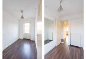De trap in de hal brengt je naar de tweede woonlaag. Hier vind je aan de voorzijde een ruime slaapkamer. Aan de achterzijde zijn twee slaapkamers waarvan één met toegang tot het dakterras op de uitbouw. Op de overloop zijn twee bergkasten; één is de ideale plek voor wasmachine en drogeropstelling. De andere bergkast is bij de douche te trekken tot een volwaardige badkamer.