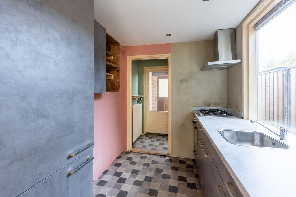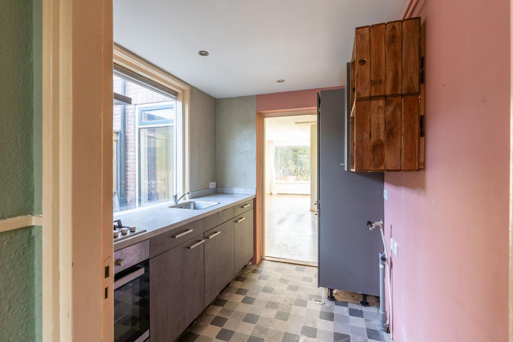 De keuken in de uitbouw aan de achterzijde dateert uit 2021. Hier vind je ook de wasmachine aansluiting. Achter de keuken is het toilet geplaatst.