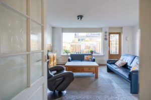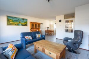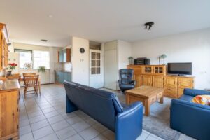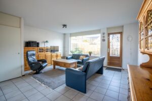 De woonkamer is voorzien van een plavuizen vloer. De woonkamer is tuingericht en heeft een deur naar de diepe achtertuin. In de woonkamer is voldoende plaats voor een ruime zithoek en een eetgedeelte.