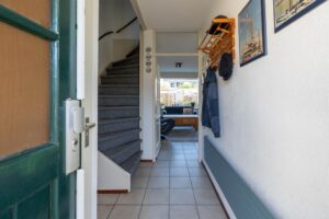 Via de prettig formaat en groene voortuin kom je bij de overdekte entree. De hal geeft toegang tot meterkast, toilet met fonteintje, trapopgang naar boven en toegang tot de woonkamer.