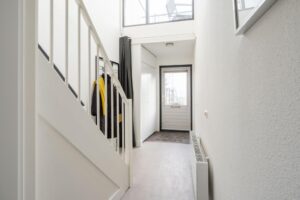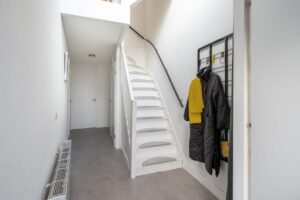 In de hal vind je ruimte voor garderobe, meterkast en toegang tot de berging met wasmachine- en drogeraansluiting (ook toegankelijk vanuit buiten).