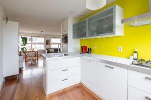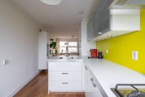 De trapopgang brengt je naar de eerste verdieping met open keuken, woonkamer en tweede toilet. Het toilet is strak en modern afgewerkt. Over de gehele verdieping ligt een massief houten parketvloer. De open keuken bevindt zich aan de voorzijde van het huis. De keuken is op maat gemaakt, strak en tijdloos vormgegeven en beschikt over diverse inbouwapparatuur waaronder een 4-pits gaskookplaat, combi oven met hete lucht en stoom (Miele), koelkast en vaatwasser (Bosch 2019). Via de keuken heb je toegang tot het balkon aan de voorzijde. Dit balkon ligt op het oosten en is dan ook een ideale plek voor je eerste kop koffie in de ochtendzon.
