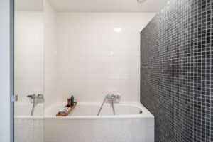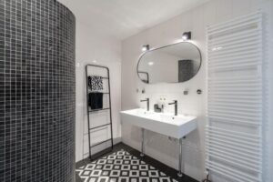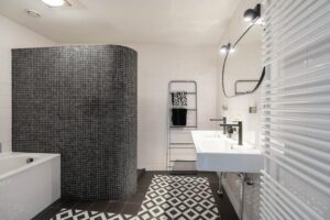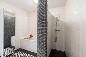 De badkamer is zeer ruim en heeft een moderne en strakke uitstraling. De badkamer is voorzien van bad, riante inloopdouche en dubbele wastafels. De zwarte accessoires, de fraaie ronding in de afscheidingswand en de combinatie van mozaïektegels met de witte wandtegel en zwart-witte tegelvloer maken het één geheel. Echt een zeer sfeervolle ruimte.