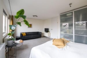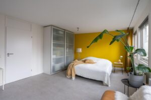 De slaapkamer op deze woonlaag is ruim met 25 m2 en biedt meer dan genoeg plek voor zowel een grote garderobekast als een zitje of bijvoorbeeld werkplek. Vanuit de bouw waren dit twee slaapkamers, wat ook eenvoudig weer als zodanig kan worden teruggebracht. De slaapkamer kent een strakke afwerking, is plezierig licht door de vele ramen en heeft een directe verbinding met de tuin.