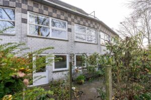 De entree van de woning ligt aan de zijde van het hofje. In de voortuin bestaat de erfafscheiding uit 3 fruitbomen. Een peren-, appel- en pruimenboom zorgen voor een vriendelijk groen aanzicht en natuurlijk: volop fruit uit eigen tuin!