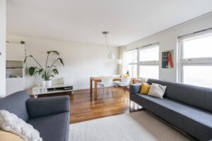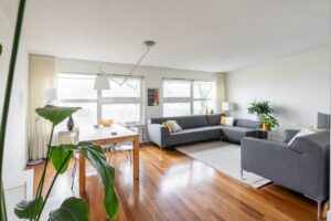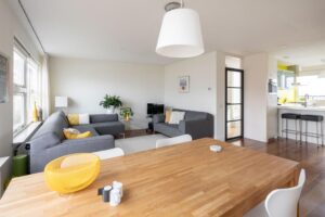 De keuken loopt aan de achterzijde over in een riante woonkamer met plek voor zowel de eettafel als een grote zithoek. De grote glaspartij brengt veel licht naar binnen en je kijkt heerlijk weg over het water en groen. Als je naar buiten kijkt, gebeurt er altijd wel iets rondom of op het water. Wat een fijne plek om te zijn!