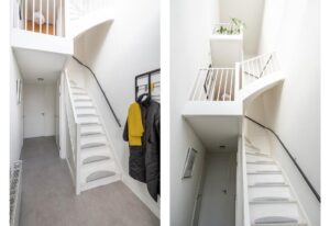Bij binnenkomst van de woning word je meteen verrast door het hoge plafond, de mooie lichtinval en de vide die alle woonlagen van het huis met elkaar verbindt. Het grote raam, dat maar liefst twee verdiepingen hoog is, zorgt voor veel natuurlijk licht in het hele huis.