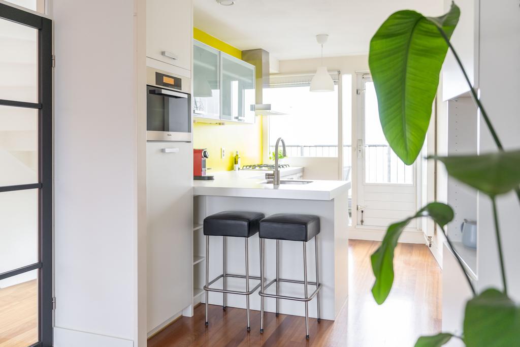 De trapopgang brengt je naar de eerste verdieping met open keuken, woonkamer en tweede toilet. Het toilet is strak en modern afgewerkt. Over de gehele verdieping ligt een massief houten parketvloer. De open keuken bevindt zich aan de voorzijde van het huis. De keuken is op maat gemaakt, strak en tijdloos vormgegeven en beschikt over diverse inbouwapparatuur waaronder een 4-pits gaskookplaat, combi oven met hete lucht en stoom (Miele), koelkast en vaatwasser (Bosch 2019). Via de keuken heb je toegang tot het balkon aan de voorzijde. Dit balkon ligt op het oosten en is dan ook een ideale plek voor je eerste kop koffie in de ochtendzon.
