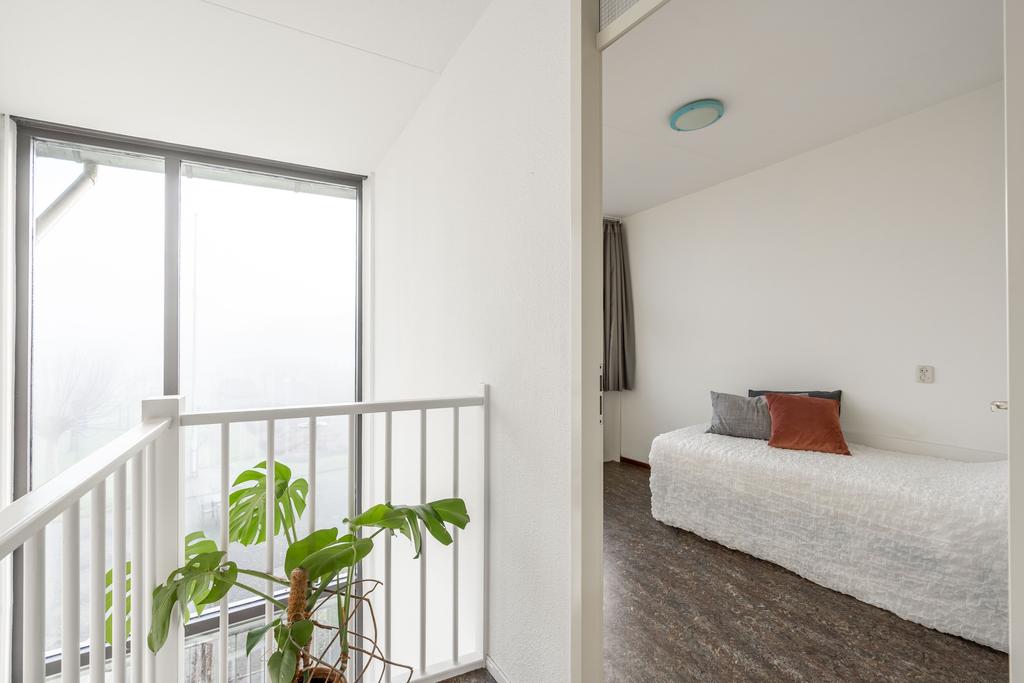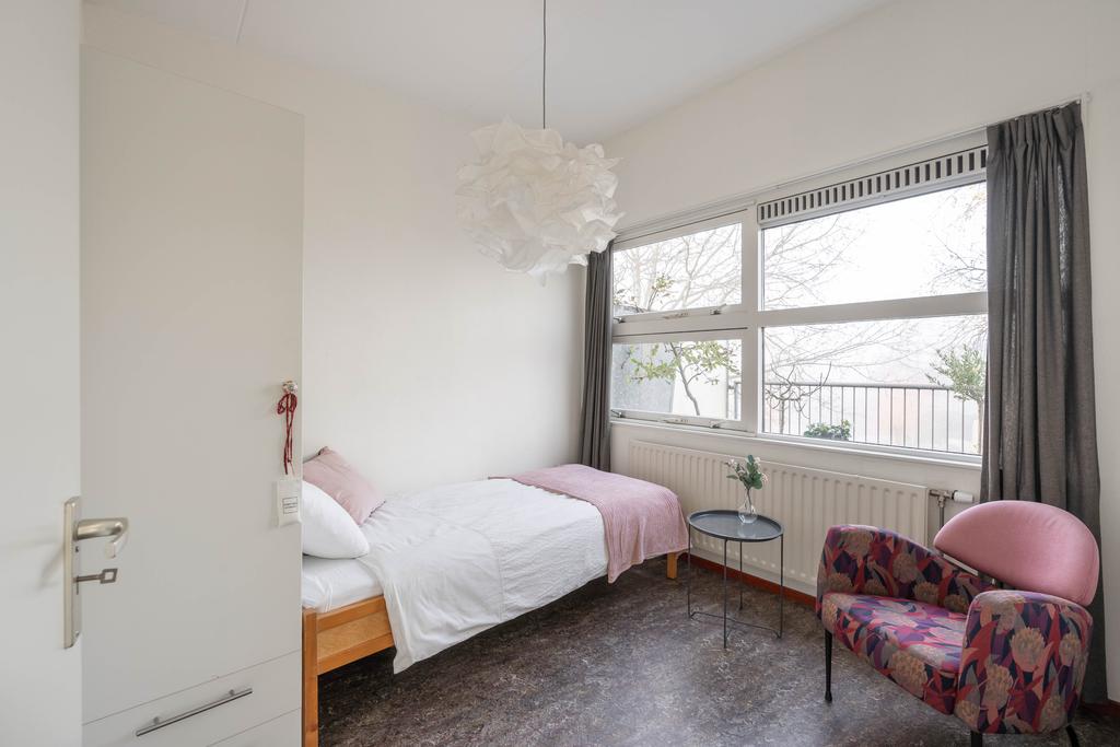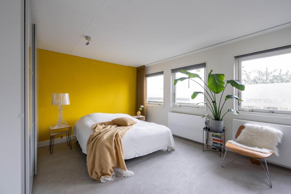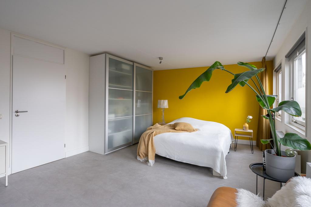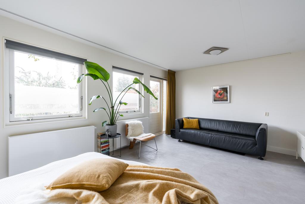 De slaapkamer op deze woonlaag is ruim met 25 m2 en biedt meer dan genoeg plek voor zowel een grote garderobekast als een zitje of bijvoorbeeld werkplek. Vanuit de bouw waren dit twee slaapkamers, wat ook eenvoudig weer als zodanig kan worden teruggebracht. De slaapkamer kent een strakke afwerking, is plezierig licht door de vele ramen en heeft een directe verbinding met de tuin.