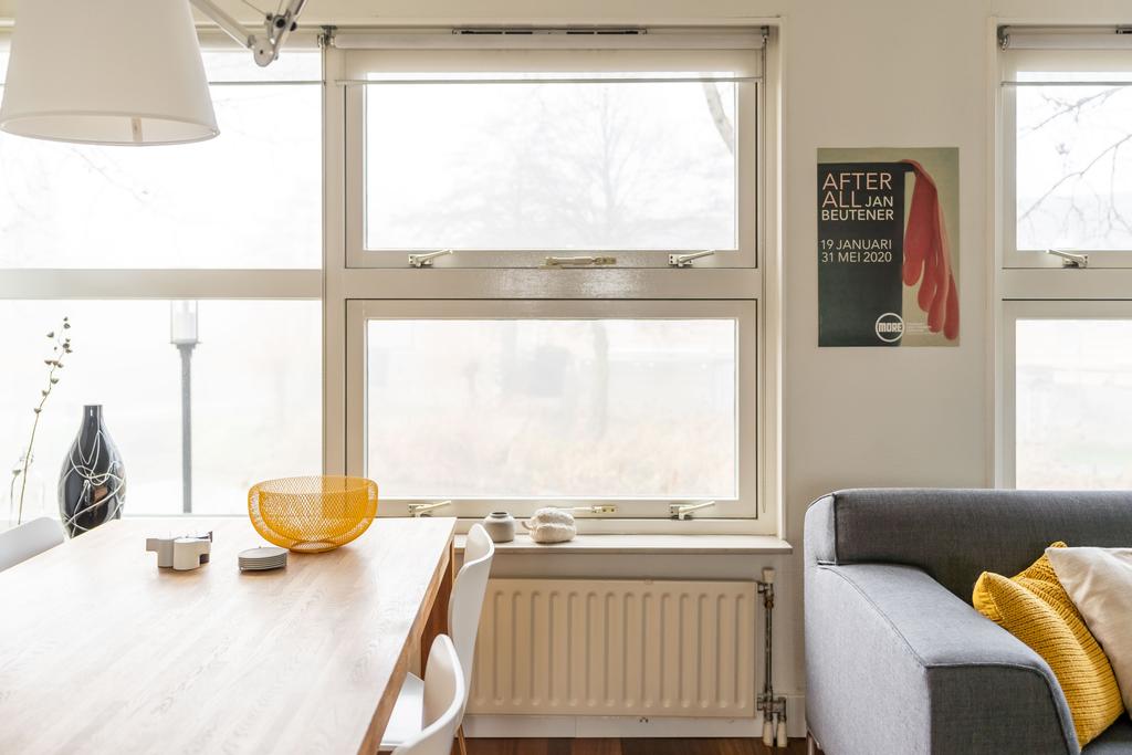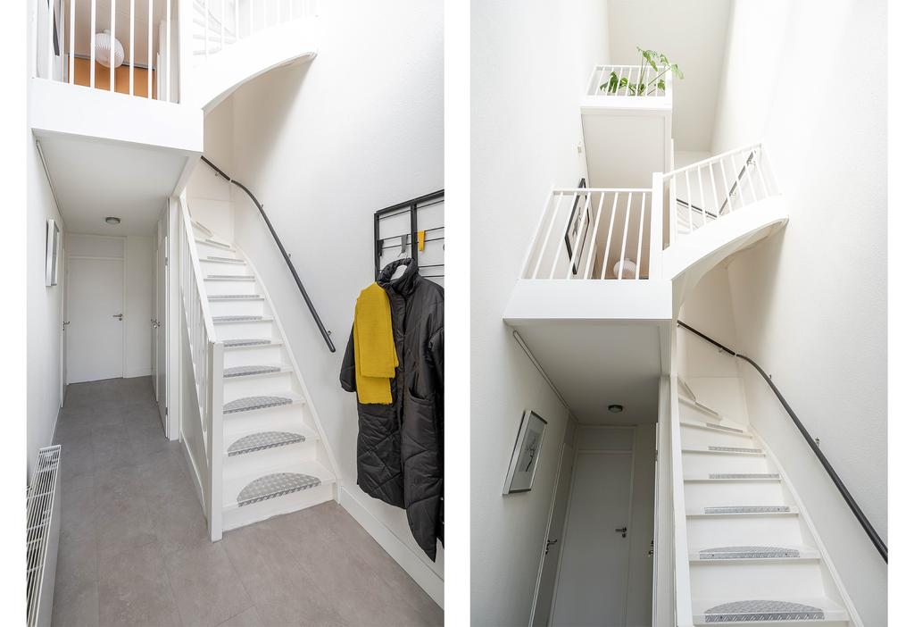 Bij binnenkomst van de woning word je meteen verrast door het hoge plafond, de mooie lichtinval en de vide die alle woonlagen van het huis met elkaar verbindt. Het grote raam, dat maar liefst twee verdiepingen hoog is, zorgt voor veel natuurlijk licht in het hele huis.