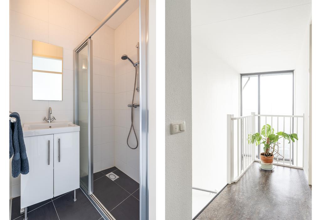 De badkamer is compact, keurig afgewerkt en voorzien van wastafel en douche.