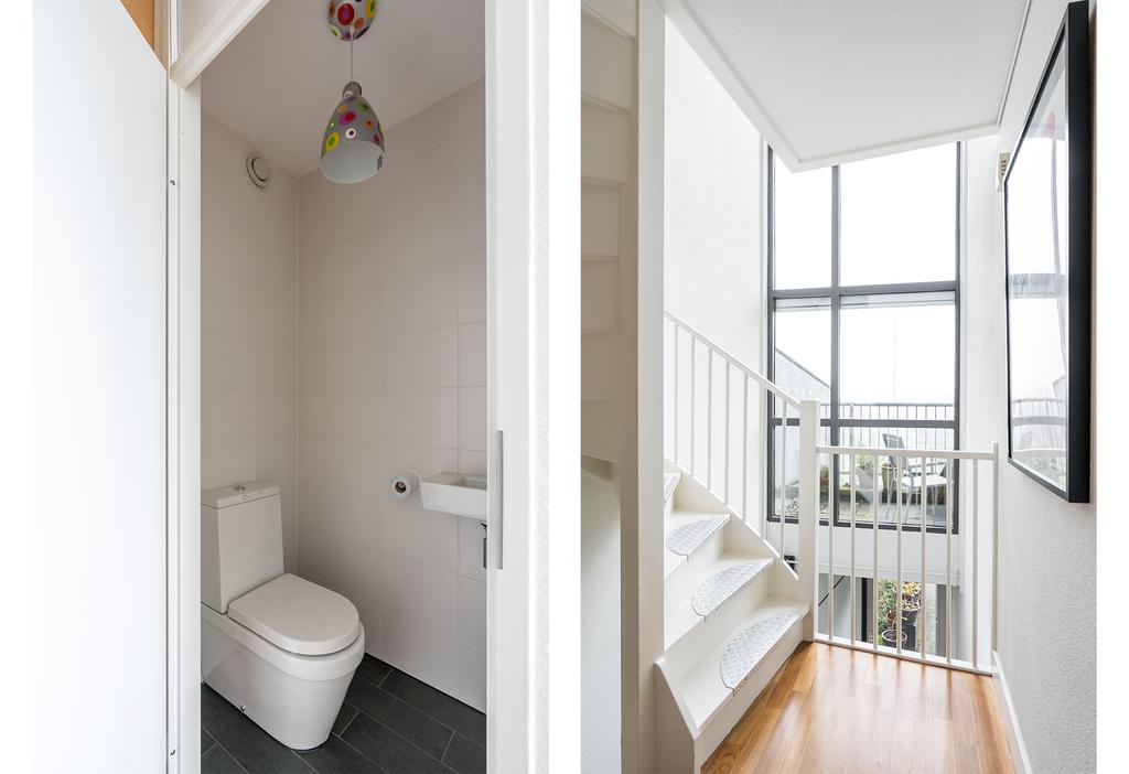 Vanuit de hal kom je vervolgens bij de trapopgang naar de eerste verdieping, het toilet, de badkamer en de grote slaapkamer.