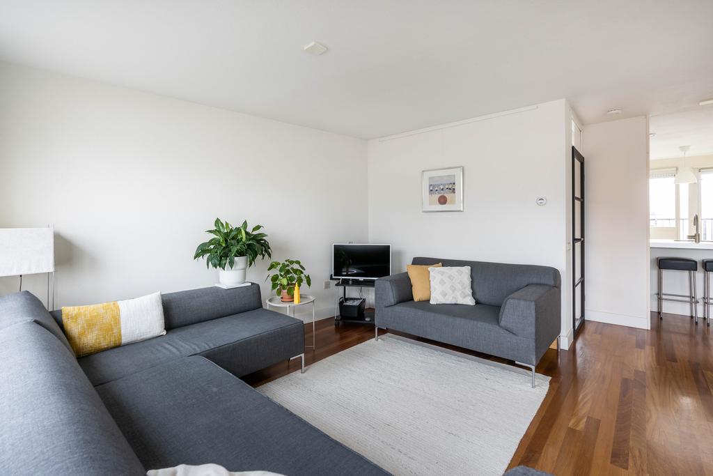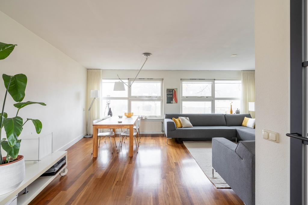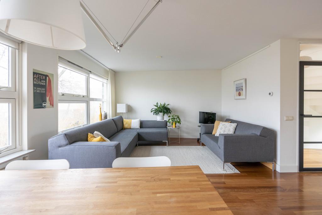 De keuken loopt aan de achterzijde over in een riante woonkamer met plek voor zowel de eettafel als een grote zithoek. De grote glaspartij brengt veel licht naar binnen en je kijkt heerlijk weg over het water en groen. Als je naar buiten kijkt, gebeurt er altijd wel iets rondom of op het water. Wat een fijne plek om te zijn!