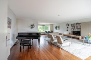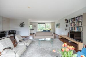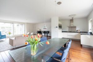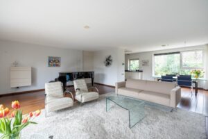 De fraaie massief houten vloer ligt over de hele verdieping in het woongedeelte en de wanden zijn strak afgewerkt met gladde stuc. Door de grote raampartijen aan zowel voor- als achterzijde is deze ruimte plezierig licht. Door de breedte van de woning is de woonkamer heerlijk ruim. De woonkamer ligt aan de tuinzijde met de grote schuifpui waar veel licht doorheen komt. Aan de achterzijde van de woning is de ideale plek voor een grote eettafel. De groenstrook maakt dat u veel privacy heeft en fijn wegkijkt in het groen.