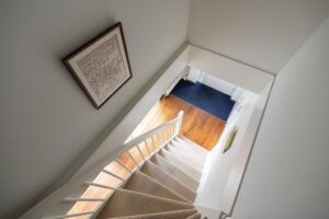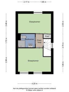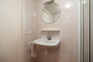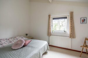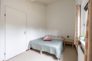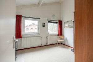 De trap in de hal brengt u naar de eerste verdieping. De overloop is plezierig licht door het raam in de zijgevel en geeft toegang tot twee slaapkamers en een tweede badkamer. De badkamer is in lichte kleurstelling en voorzien van douche, vaste wastafel en toilet. In beide slaapkamers ligt een keurige lichte vloerbedekking en de wanden zijn netjes afgewerkt. Doordat de nok open is gehouden, voelen de slaapkamers extra ruim aan en is er plek voor bijvoorbeeld een hoogslaper waardoor kamers een dubbele functie kunnen hebben.