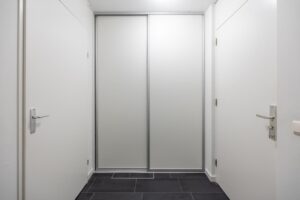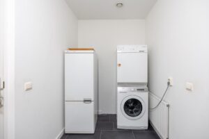 Via de badkamer bereikt u tenslotte de nette berging/bijkeuken. Hier vindt u de wasmachine/droger aansluiting en een handige inbouwkast. De kast is zeer praktisch ingedeeld zodat, naast de vele opbergruimte, ook de strijkplank achter de deur uit het zicht is. In de berging ligt dezelfde tegelvloer als in de badkamer. Tenslotte heeft de berging heeft een deur naar de garage.