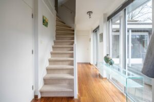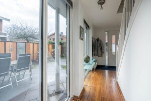 Via de entree komt u in de ruime en lichte hal met toilet met fonteintje, trapopgang, meterkast, garderobe en toegang tot zowel de garage als de woonkamer. De hal loopt langs de patiotuin met een prettige lichtinval.