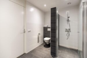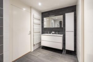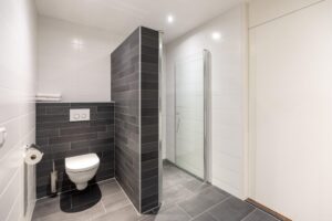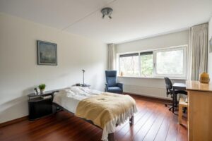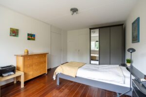 De slaapkamer is bereikbaar vanuit de woonkamer. Ook hier vindt u weer een gelijke nette vloer- en wandafwerking. De slaapkamer is ruim met 18 m2 en biedt dan ook volop ruimte voor een groot bed en veel kledingkasten. Naast de slaapkamer bevindt zich een mooie en keurig onderhouden badkamer. De badkamer is in neutrale zwart-wit kleurstelling en beschikt over een ruimte inloopdouche, 2e toilet en een dubbel wastafelmeubel met kast.