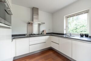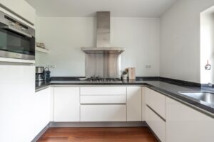 De keuken bevindt zich aan de achterzijde van de woning. De goed onderhouden Siematic keuken is in neutrale kleurstelling en voorzien van een stenen werkblad. De ruime keuken is in U- opstelling en voorzien van diverse inbouwapparatuur zoals een 5-pits gaskookplaat, Miele vaatwasser, twee combi-ovens (Miele) en koelkast. Een fijne plek met veel werkruimte om te koken en met zicht op het groen.