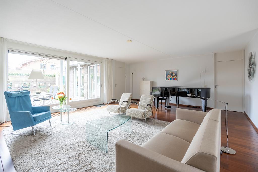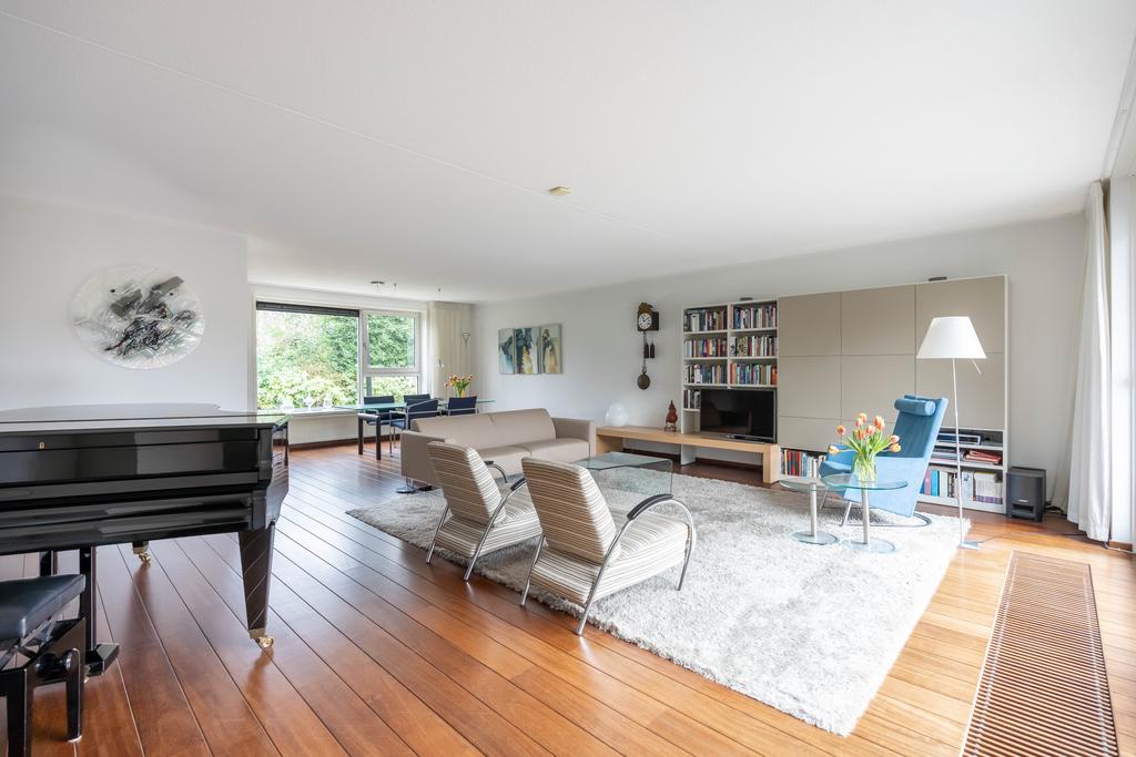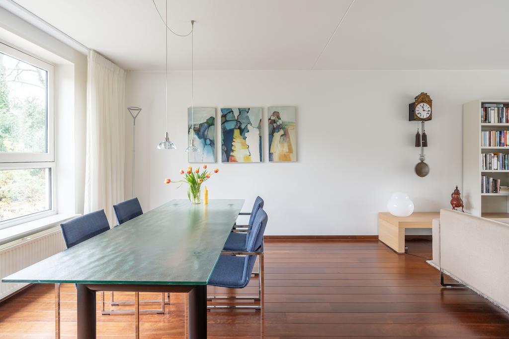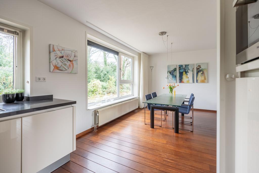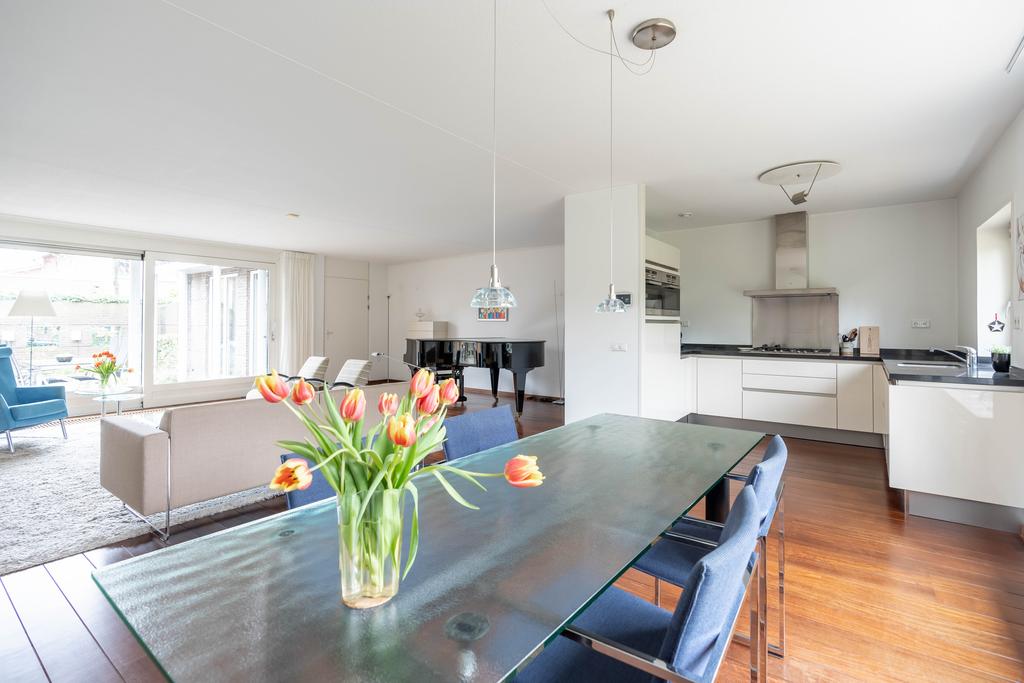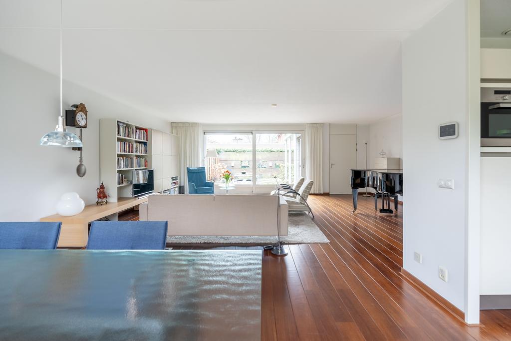 De fraaie massief houten vloer ligt over de hele verdieping in het woongedeelte en de wanden zijn strak afgewerkt met gladde stuc. Door de grote raampartijen aan zowel voor- als achterzijde is deze ruimte plezierig licht. Door de breedte van de woning is de woonkamer heerlijk ruim. De woonkamer ligt aan de tuinzijde met de grote schuifpui waar veel licht doorheen komt. Aan de achterzijde van de woning is de ideale plek voor een grote eettafel. De groenstrook maakt dat u veel privacy heeft en fijn wegkijkt in het groen.