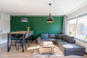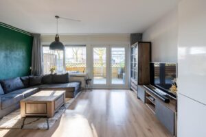 De woonkamer is ruim en tuingericht. Hier is genoeg plek om een gezellige zithoek te creëren. In de woonkamer is de eethoek geplaatst. Hier past een lekkere tafel om gezellig te dineren of eventueel een werkplek in te richten.