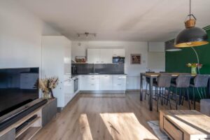 De open keuken ligt in de hoek van de leefruimte. De keuken is strak en tijdloos met mat-witte fronten en een donker blad.