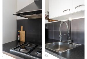 De keuken is voorzien van een koel- vriescombinatie, 4-pits gasfornuis, magnetron, hete lucht oven en een vaatwasser. Alles in goede staat. De strakke tegels op de achterwand maakt het geheel af. Voldoende werkruimte om heerlijk te koken.