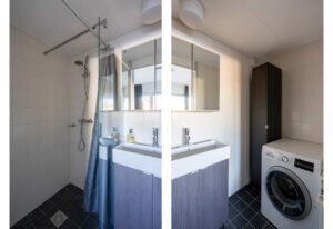 Via de slaapkamer kom je in de badkamer voorzien van inloopdouche, een wastafelmeubel en de wasmachine/droger aansluiting.