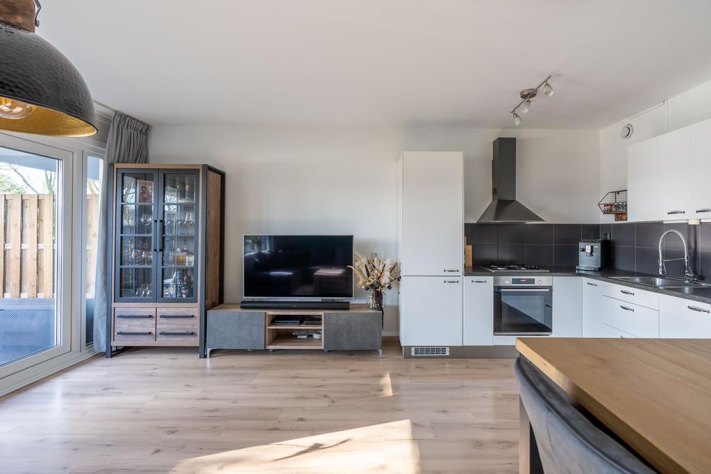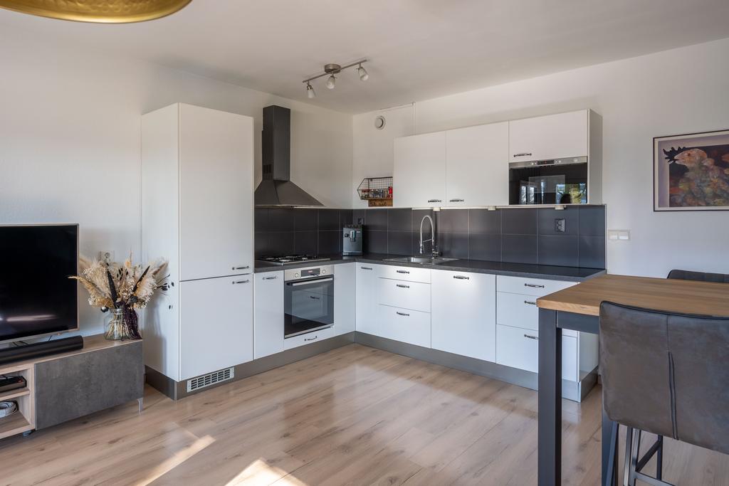 De open keuken ligt in de hoek van de leefruimte. De keuken is strak en tijdloos met mat-witte fronten en een donker blad.