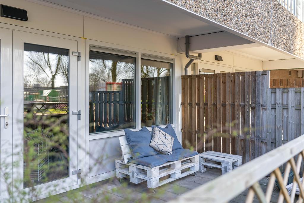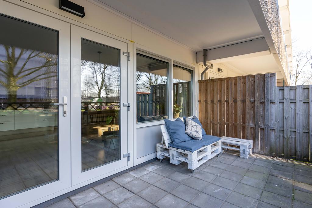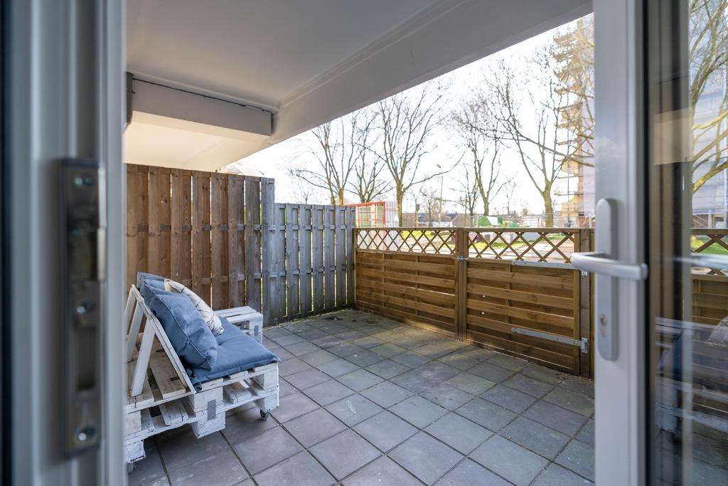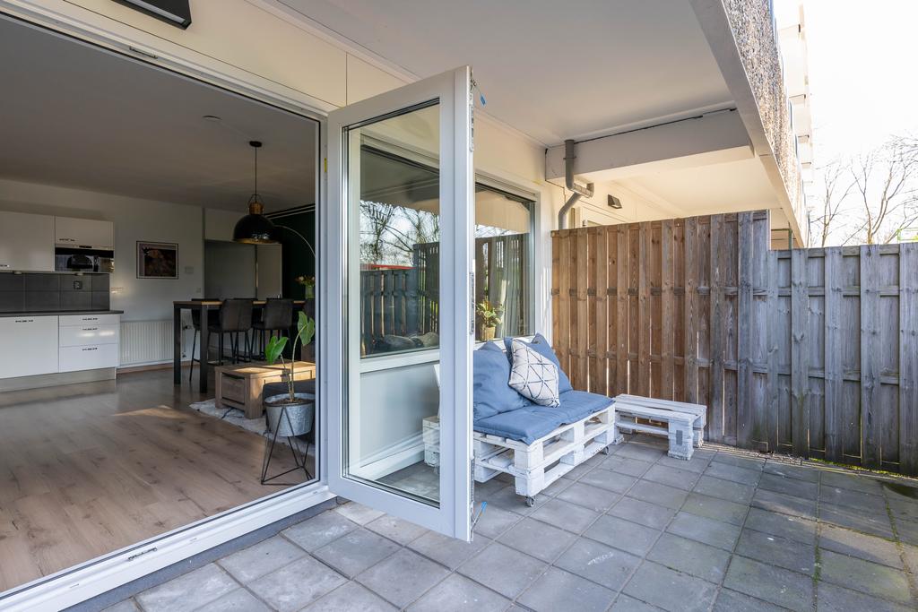 De toegangsdeur naar de tuin ligt aan de achterzijde. Hier is een heerlijk terras op het zuiden en kun je lekker genieten van de zon.
