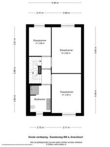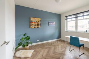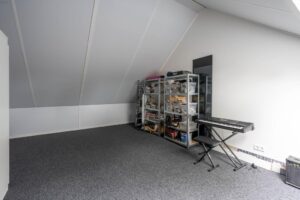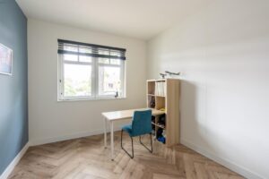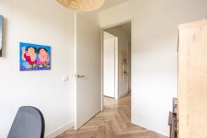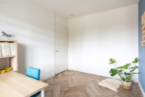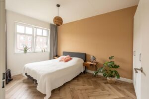 Ook op deze verdieping is een mooie pvc-vloer gelegd, in eenzelfde kleurstelling als op de begane grond. Voor het complete plaatje ook hier glad afgewerkte wanden en mooie hoge plinten. Je vindt op deze woonlaag 3 slaapkamers en een grote badkamer. De grootste slaapkamer meet ca. 15 m2 en biedt dan ook plek voor een groot bed en een riante kledingkast. De kamer is plezierig licht door de grote raampartij. De andere slaapkamer aan de achterzijde meet ca. 7 m2 en is zeer geschikt als werkkamer of kinderkamer. Door de afmeting van de kamer past hier ook prima een eenpersoonsbed. Aan de voorzijde van het huis bevindt zich de derde slaapkamer en de badkamer. Deze derde slaapkamer is ook ruim met ca. 13 m2.