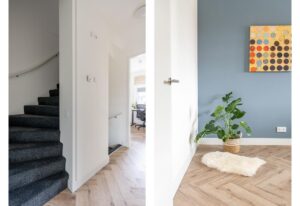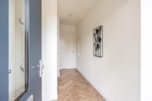 Als je de entree binnenkomt vind je het keurige toilet, meterkast en trapopgang naar boven. Wat meteen opvalt is de nette en strakke afwerking door de gehele woning. Over de gehele woning ligt een fraaie pvc vloer, gelegd in visgraat en in een sfeervolle lichte kleurstelling. Daarmee heb je de charme van een houten vloer en toch het gemak en comfort in onderhoud.
