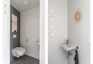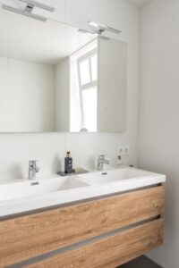 De badkamer is modern afgewerkt in lichte kleurstelling en voorzien van grote dubbele wastafel met meubel, toilet en een ruime inloopdouche. Het grote raam zorgt voor de natuurlijke en plezierige daglichttoetreding.