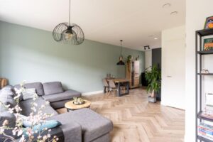 Het eetgedeelte loopt over in de woonkamer. Hier is alle ruimte voor een sfeervolle zithoek. De grote trapkast biedt veel handige opbergruimte.
