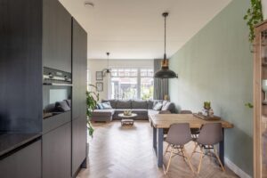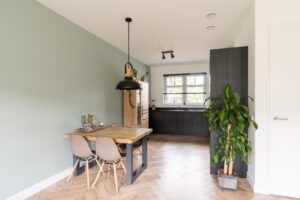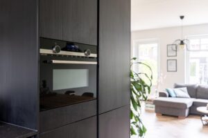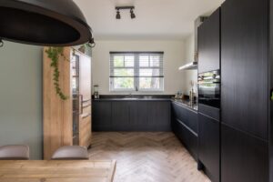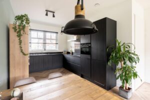 De keuken bevindt zich aan de voorzijde van het huis. Deze is in moderne uitvoering met matte zwarte frontjes met houtnerf en strak dun zwart composiet werkblad. De keuken is verder voorzien van diverse inbouwapparatuur; zoals een koel-vriescombinatie, oven, inductiekookplaat en vaatwasser (alles Siemens, 2022). De L-opstelling van de keuken zorgt ervoor dat er nog veel ruimte is in het eetgedeelte voor een grote eettafel. Zo kan je koken en tegelijkertijd gezellig bijkletsen met je huisgenoten.
