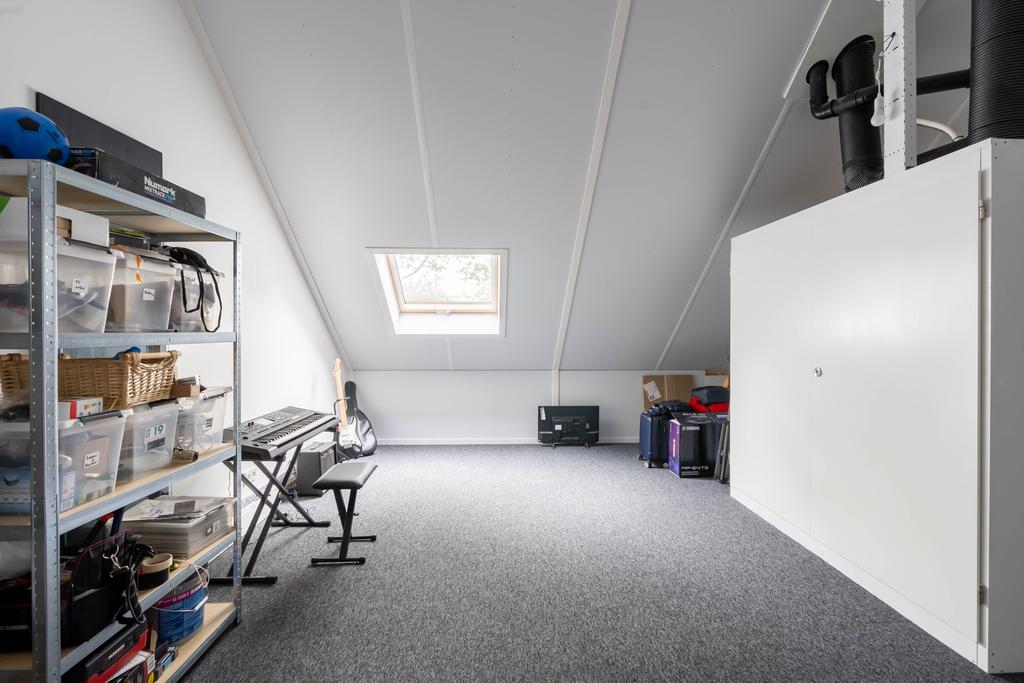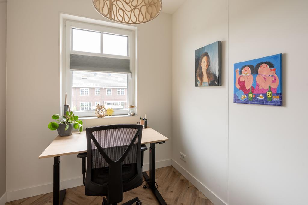 Ook op deze verdieping is een mooie pvc-vloer gelegd, in eenzelfde kleurstelling als op de begane grond. Voor het complete plaatje ook hier glad afgewerkte wanden en mooie hoge plinten. Je vindt op deze woonlaag 3 slaapkamers en een grote badkamer. De grootste slaapkamer meet ca. 15 m2 en biedt dan ook plek voor een groot bed en een riante kledingkast. De kamer is plezierig licht door de grote raampartij. De andere slaapkamer aan de achterzijde meet ca. 7 m2 en is zeer geschikt als werkkamer of kinderkamer. Door de afmeting van de kamer past hier ook prima een eenpersoonsbed. Aan de voorzijde van het huis bevindt zich de derde slaapkamer en de badkamer. Deze derde slaapkamer is ook ruim met ca. 13 m2.
