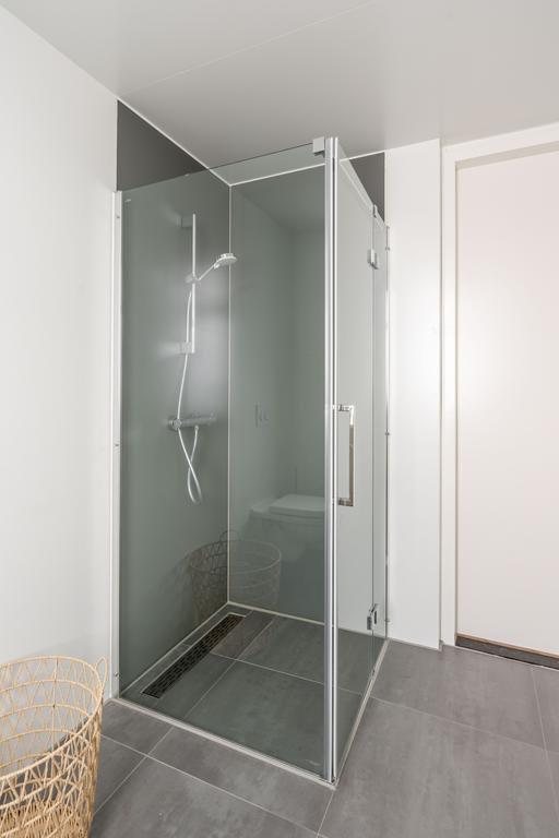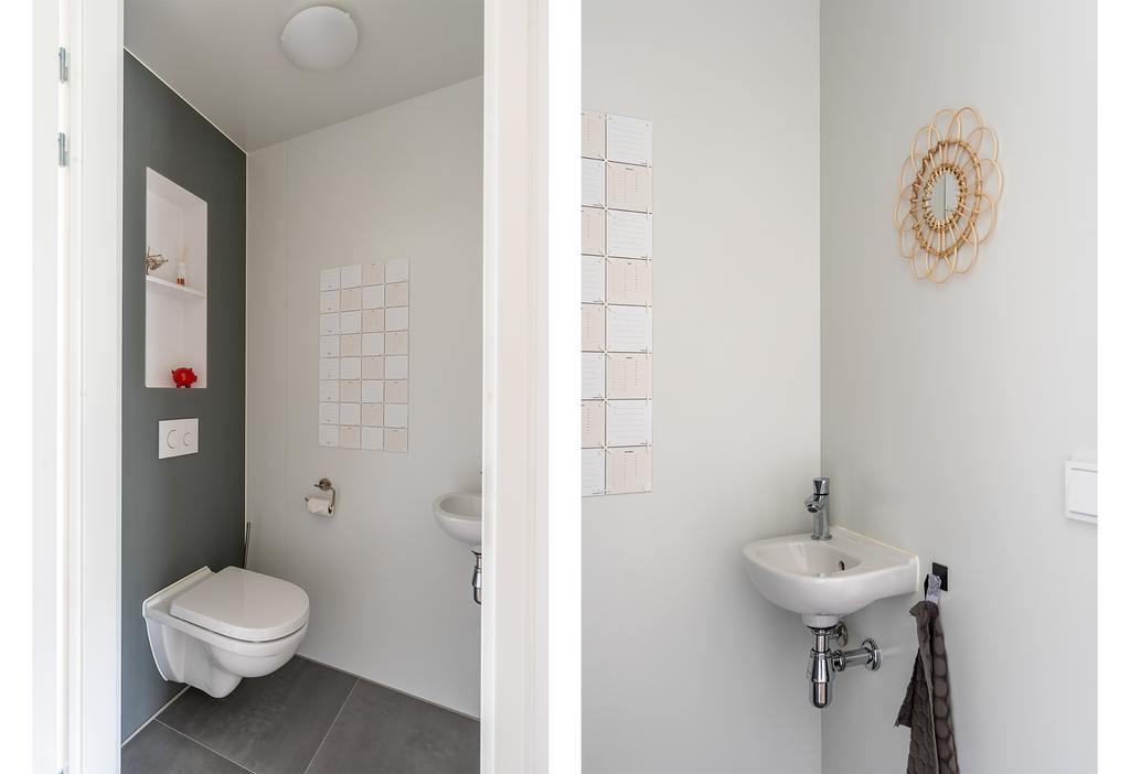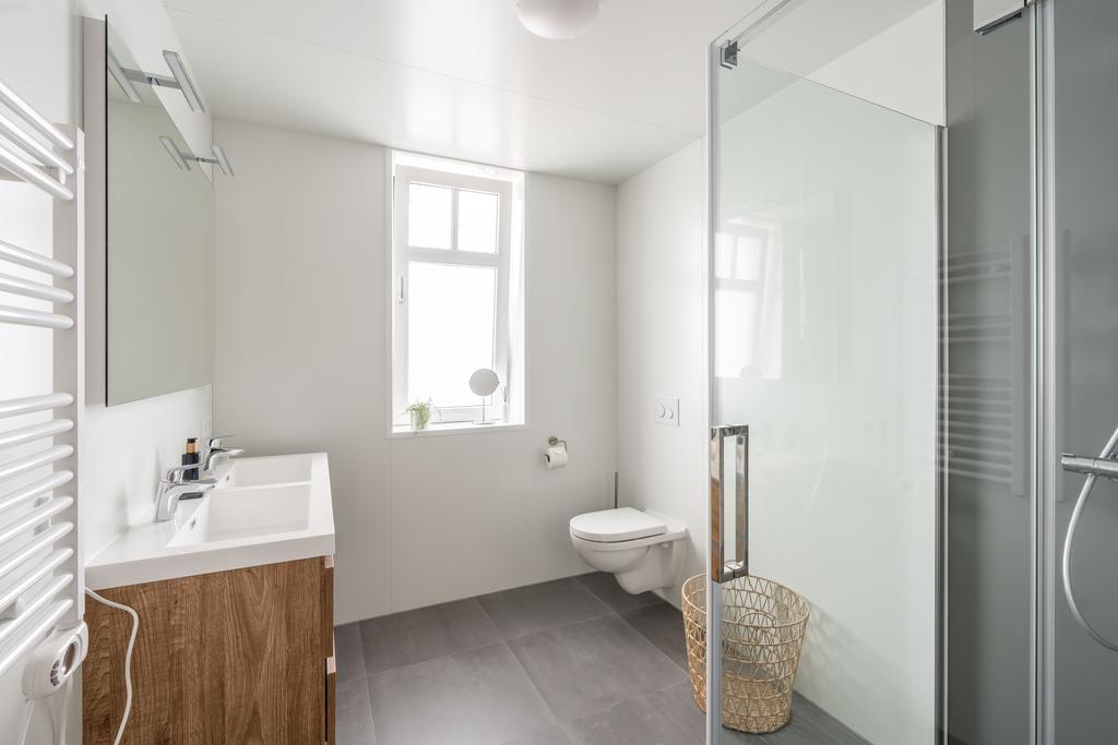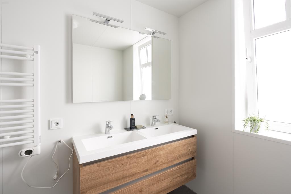 De badkamer is modern afgewerkt in lichte kleurstelling en voorzien van grote dubbele wastafel met meubel, toilet en een ruime inloopdouche. Het grote raam zorgt voor de natuurlijke en plezierige daglichttoetreding.