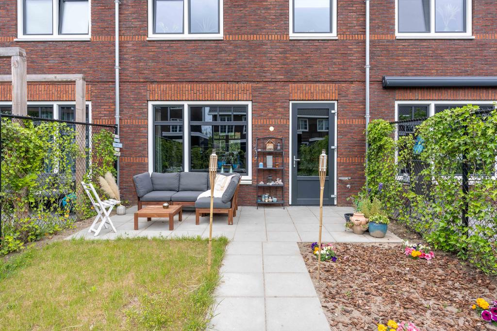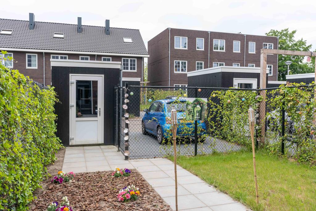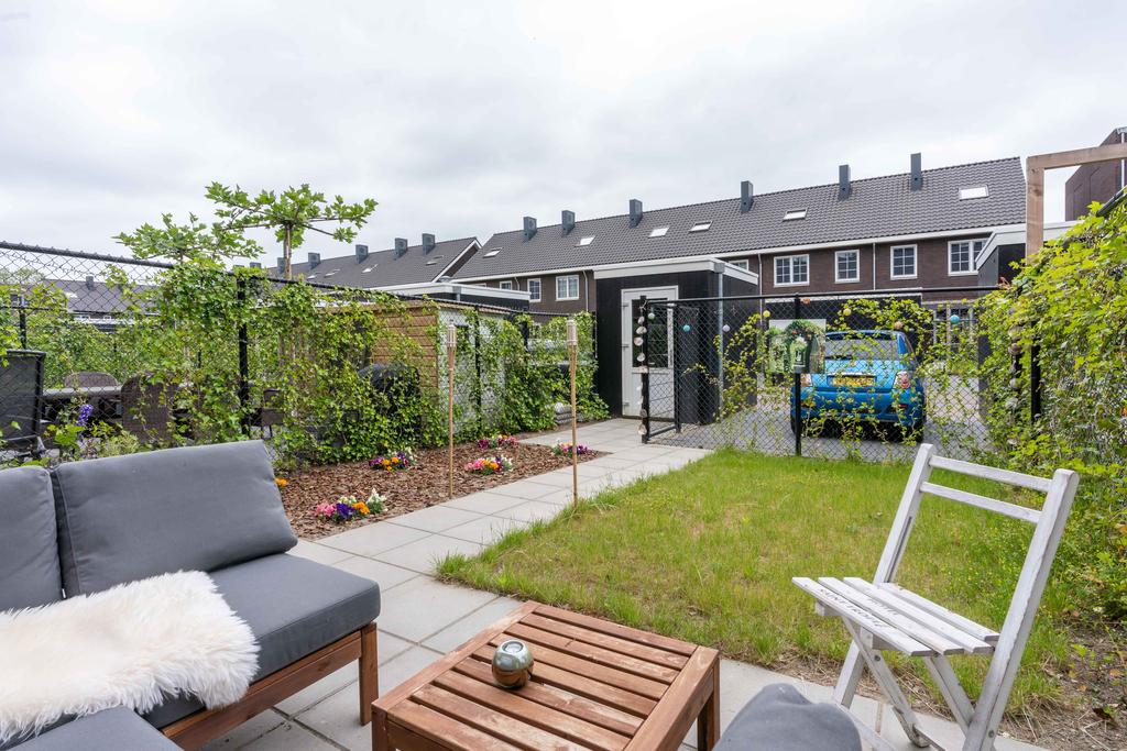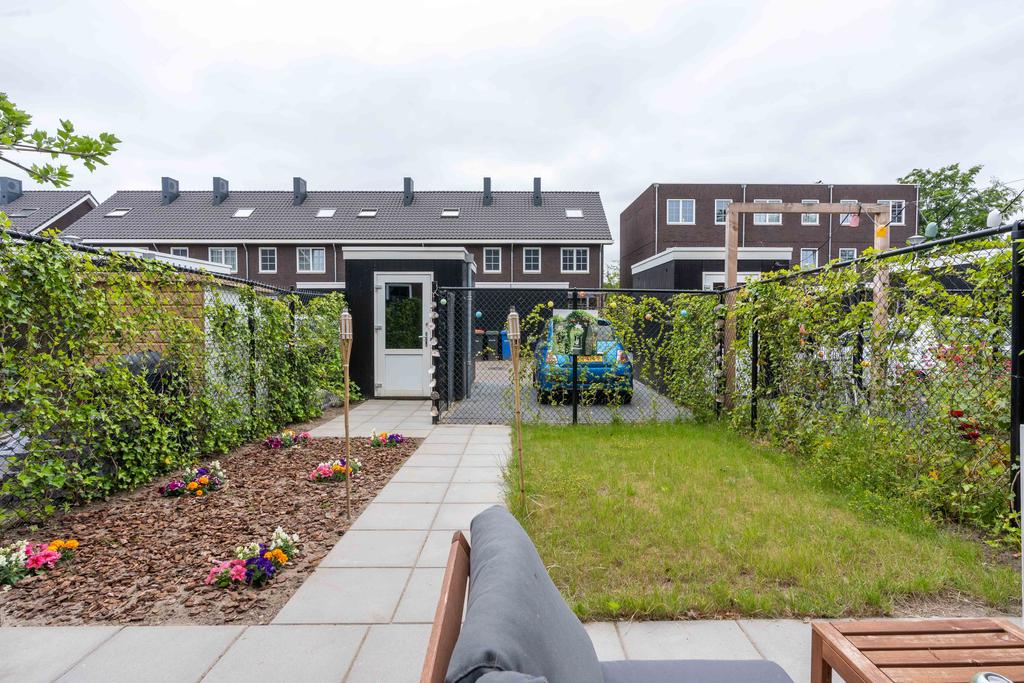 De tuin ligt perfect op het zuiden. Dat betekent dat je de hele middag tot aan het einde van de dag heerlijk kunt genieten van de zon! Achterin de tuin vind je een houten schuur om fietsen en andere spullen in op te bergen. Direct grenzend aan de tuin is je eigen parkeerplaats met mogelijkheid tot het plaatsen van een laadpaal.