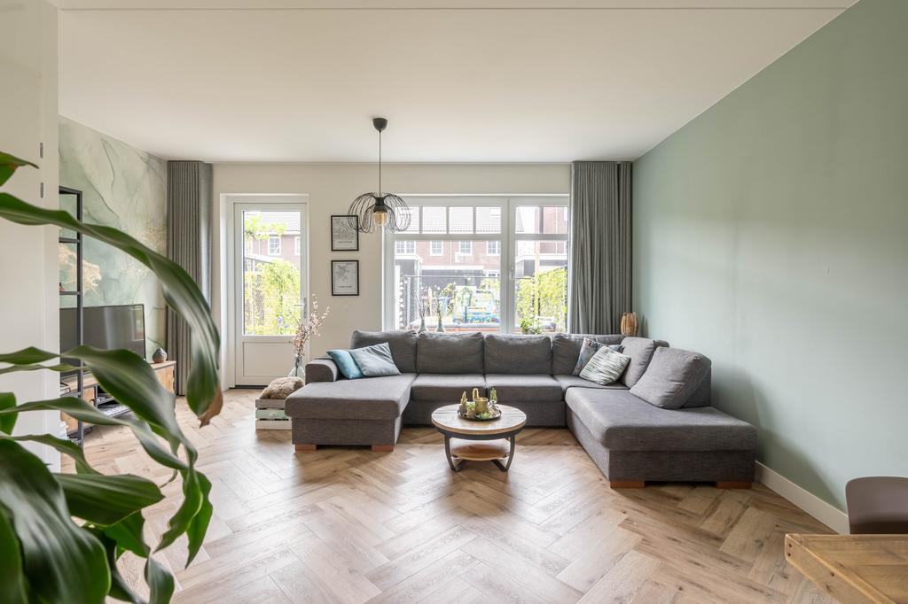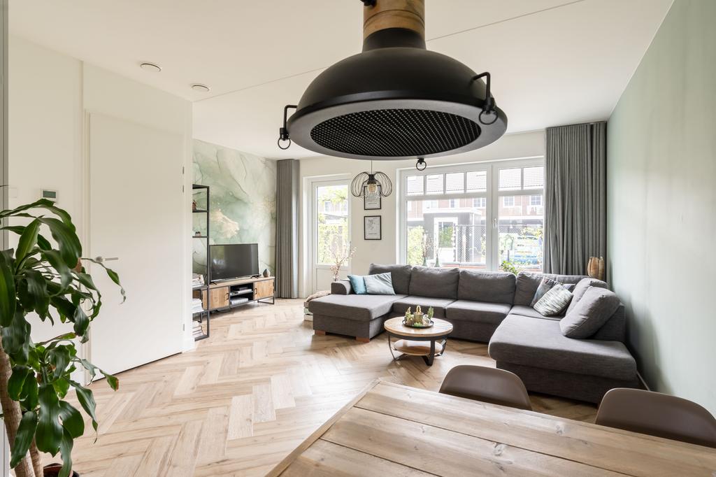 Het eetgedeelte loopt over in de woonkamer. Hier is alle ruimte voor een sfeervolle zithoek. De grote trapkast biedt veel handige opbergruimte.