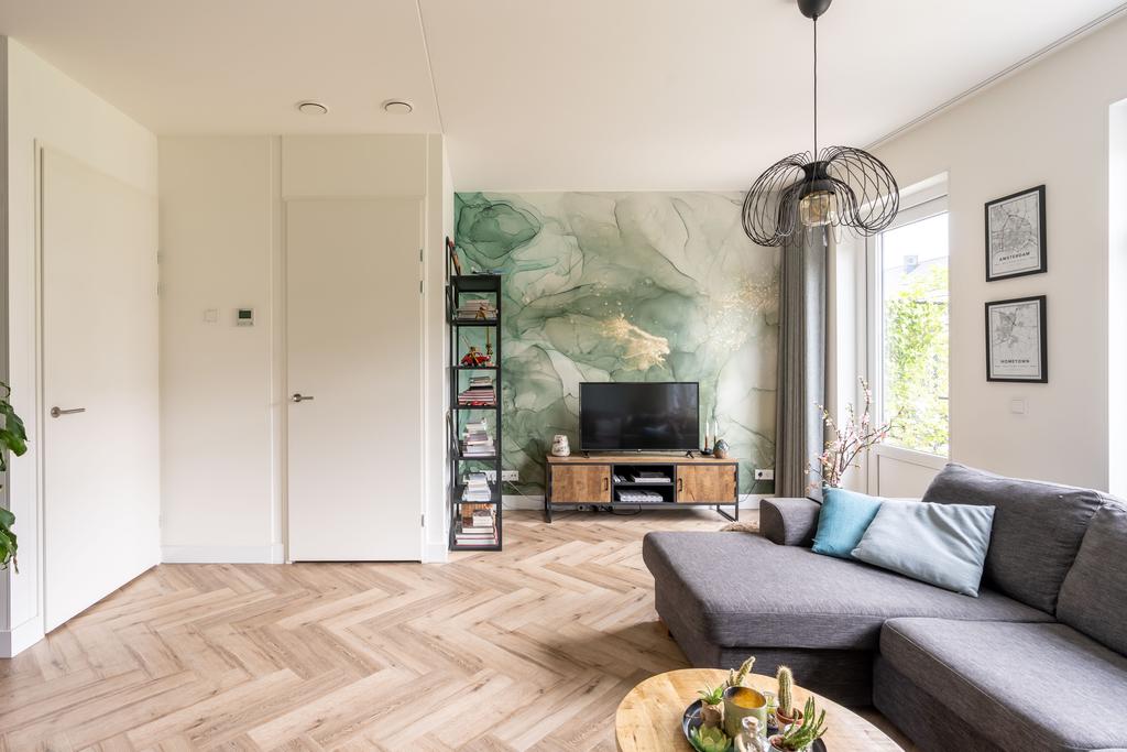 Als je de entree binnenkomt vind je het keurige toilet, meterkast en trapopgang naar boven. Wat meteen opvalt is de nette en strakke afwerking door de gehele woning. Over de gehele woning ligt een fraaie pvc vloer, gelegd in visgraat en in een sfeervolle lichte kleurstelling. Daarmee heb je de charme van een houten vloer en toch het gemak en comfort in onderhoud.