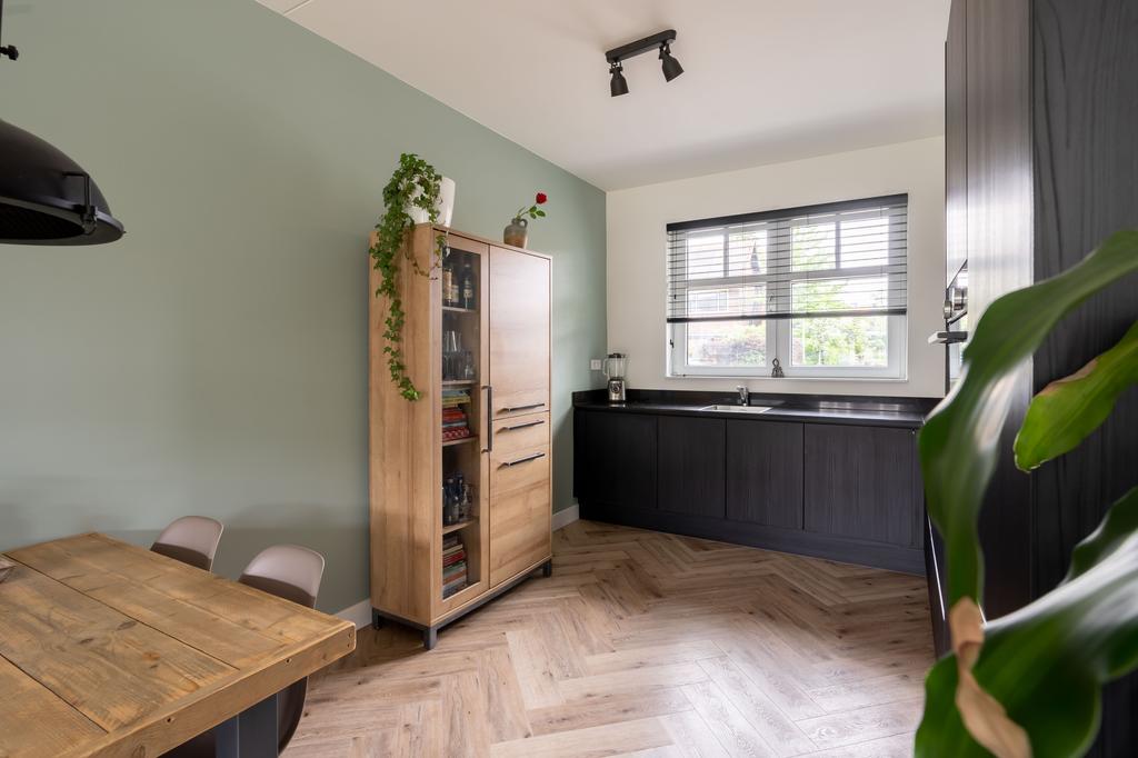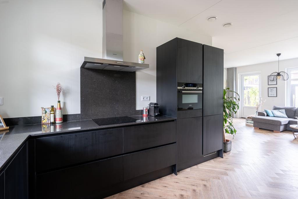 De keuken bevindt zich aan de voorzijde van het huis. Deze is in moderne uitvoering met matte zwarte frontjes met houtnerf en strak dun zwart composiet werkblad. De keuken is verder voorzien van diverse inbouwapparatuur; zoals een koel-vriescombinatie, oven, inductiekookplaat en vaatwasser (alles Siemens, 2022). De L-opstelling van de keuken zorgt ervoor dat er nog veel ruimte is in het eetgedeelte voor een grote eettafel. Zo kan je koken en tegelijkertijd gezellig bijkletsen met je huisgenoten.