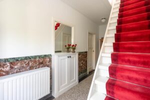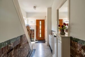 Via de prachtige entree kom in je de hal. Bij binnenkomst in de hal zie en proef je de sfeer die deze woningen zo populair maakt met de oude tegellambrisering, de granitovloer die in ere is hersteld, de hoge plafonds en de paneeldeuren.