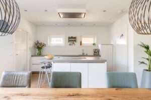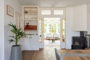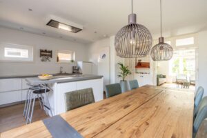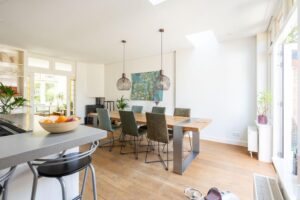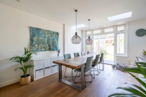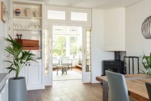 Hier vind je de houtkachel, die tevens de radiatoren van de woning verwarmt. Een sfeermaker in de achterkamer waar een heerlijke plek voor een grote eettafel is gekomen om lekker lang te tafelen.