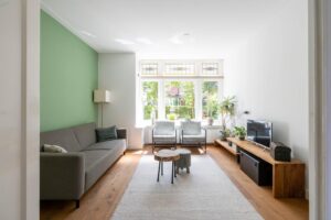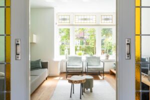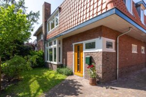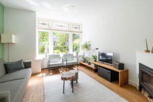 In de woonkamer is de en suite op smaakvolle wijze teruggebracht. Hierdoor is een heerlijke knusse voorkamer gecreëerd met een gezellige zithoek. De erker en de fijne haard zorgen hier voor instant sfeer. Vanuit de erker met het grote raam aan de voorzijde kijk je gezellig weg over de groene tuin en het karakteristieke straatbeeld.